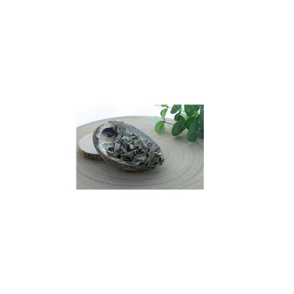 Mode d'emploi : Pour faire brûler la sauge, placer quelques feuilles au centre d’une coquille d’abalone, allumer de préférence avec une allumette afin de bien embraser le tout.